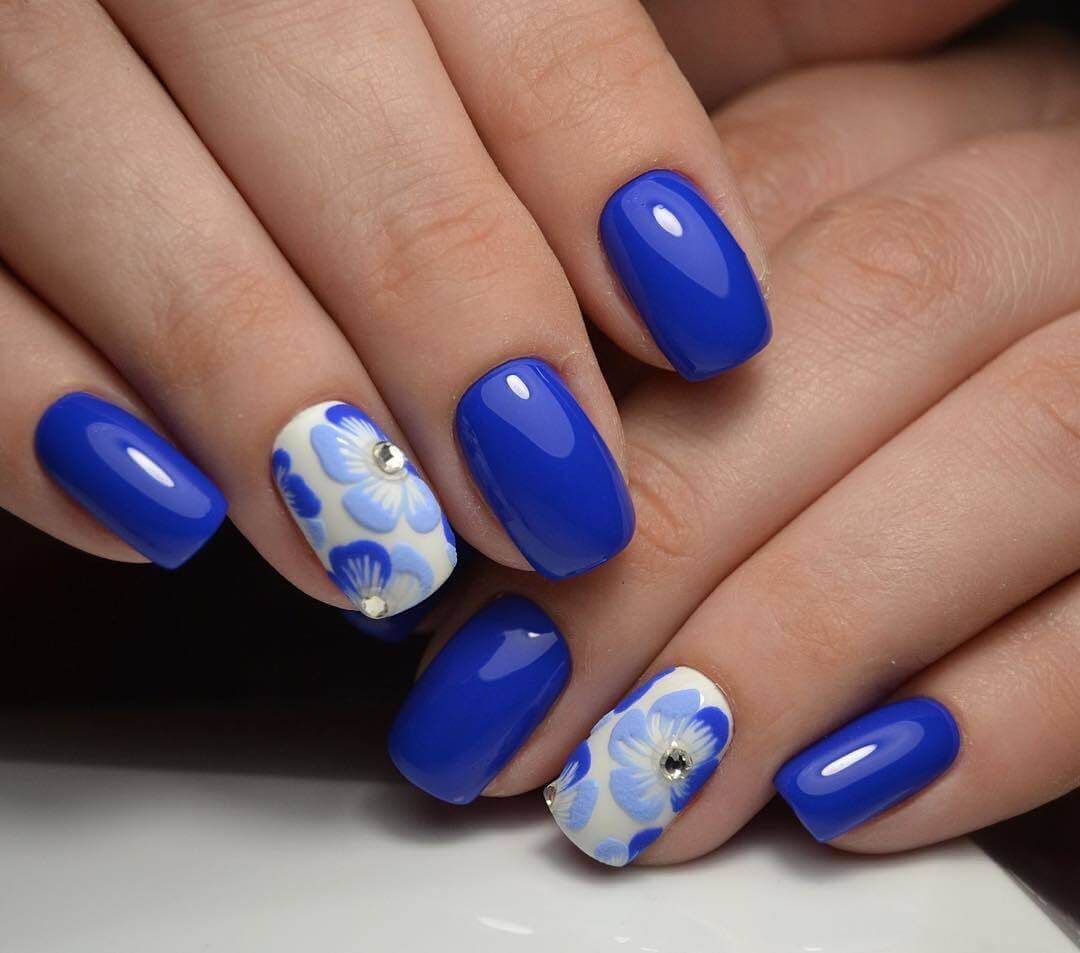 More recently, the blue tones of the lacquer were used only in the classic monochromatic design. Today, blue nail designs are a stunning combination of the eponymous coating with light and bright shades, as well as a wide variety of execution techniques. In the stylish novelties of the summer, there are many patterns and an abundance of jewelry in the form of rhinestones, beads, glitter and other variations of décor. Manicure “different handles”, gradient, french, “negative space”, design with rubbing, matte manicure are just a part of the many trendy design ideas.