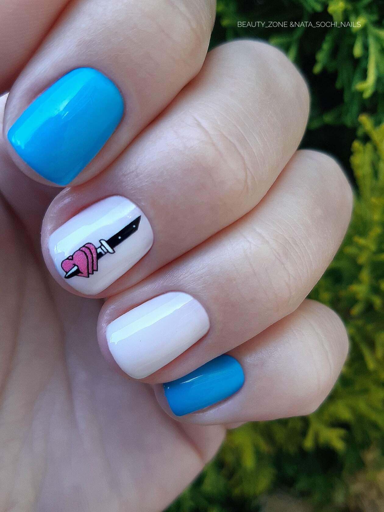 Such a duet combination looks much softer than monochromatic variations and allows the nails to look more feminine. It can be a charming alternate coloring, blue patterns on a white base, or vice versa, white patterns on blue marigolds. The blue and white tandem looks gorgeous using the French technique, which allows you to combine the colors of the base and smile in an original way. Gradient transitions are impressive whether they are vertical or horizontal. A novelty of the summer season is floral or openwork drawings with white acrylic powder. “Sugar” just looks magical on a blue background, and at the request of a fashionista, it can decorate adjacent nail plates, duplicating the color of the main coating.