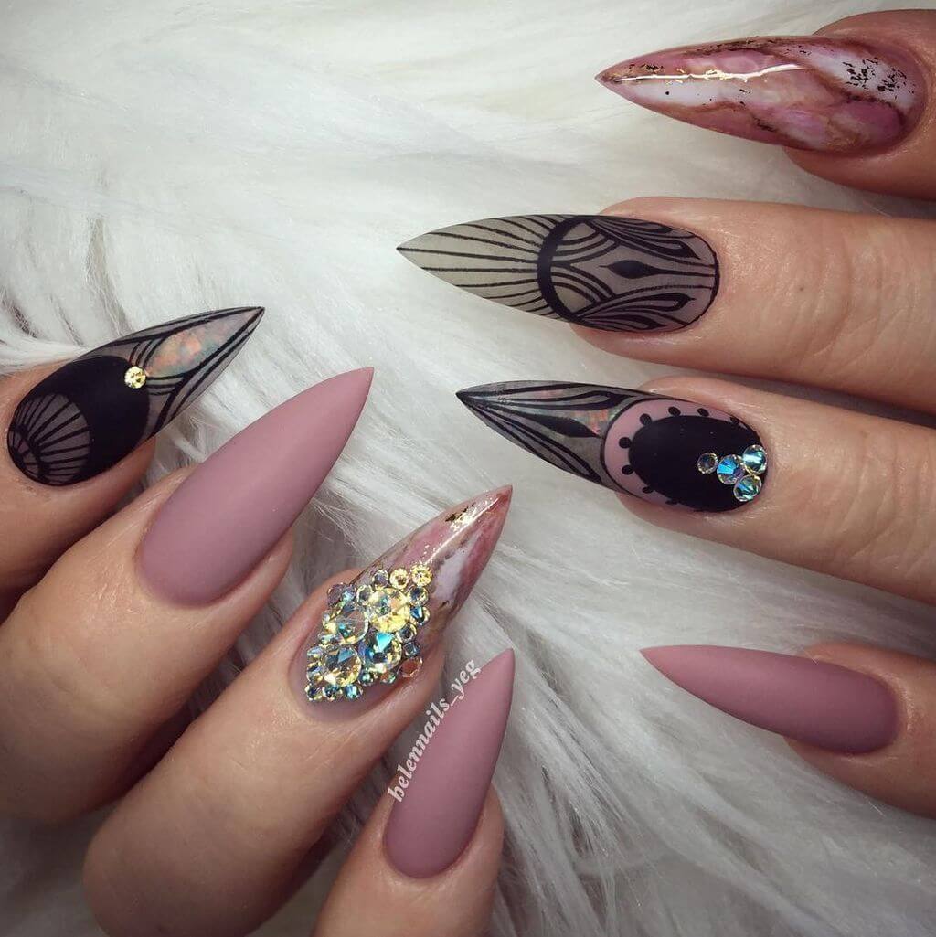 Owners of long nails know well how to refine and soften their nail art. To do this, they use a matte texture, melange, “sugar” and other material that gives the marigolds velvety softness. Matte manicure on sharp nails can be done in dark, saturated shades. Most often, burgundy and black colors are used for design. Rhinestones are placed in the classical way: in the root zone, in the middle of the nail with a strip, across the nail, in the form of a wave.