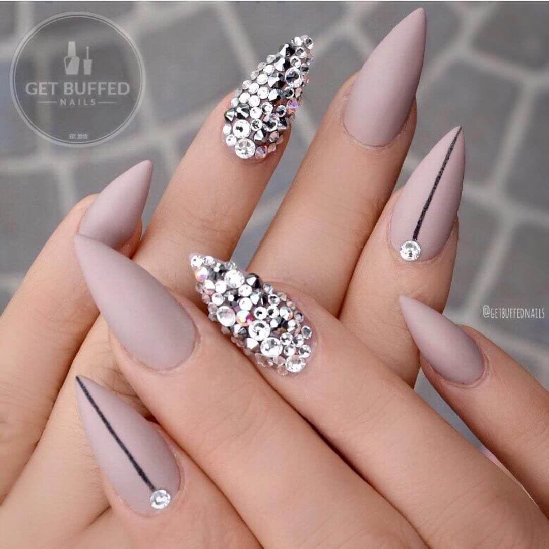 12 Matte manicure on sharp nails with rhinestones